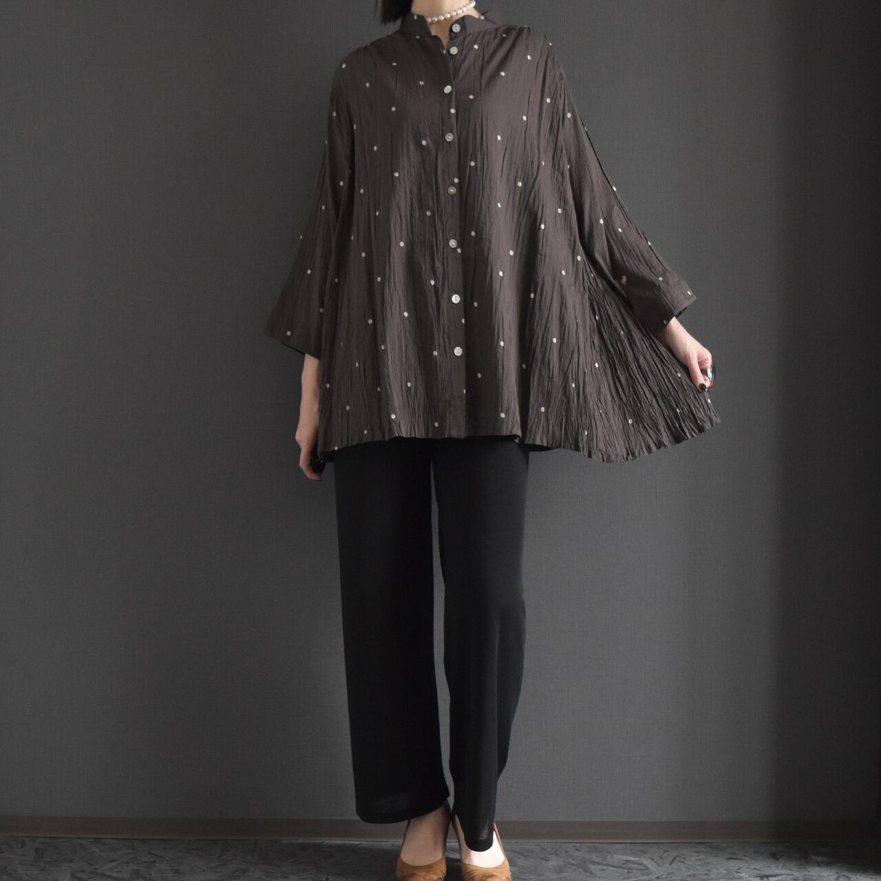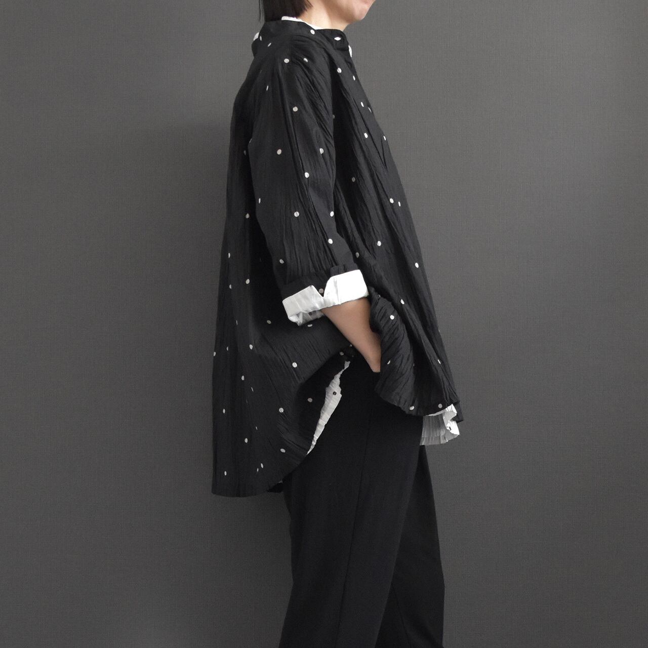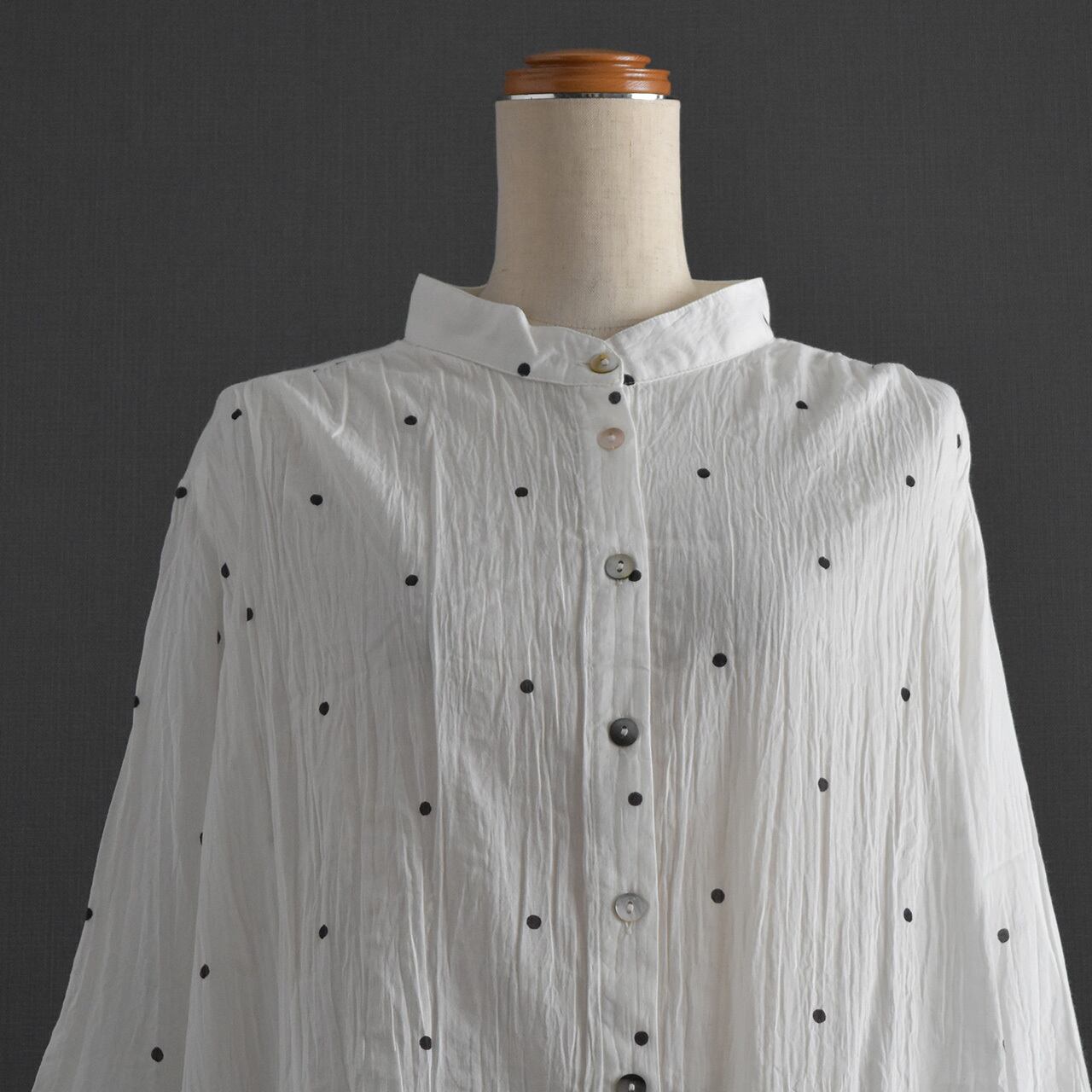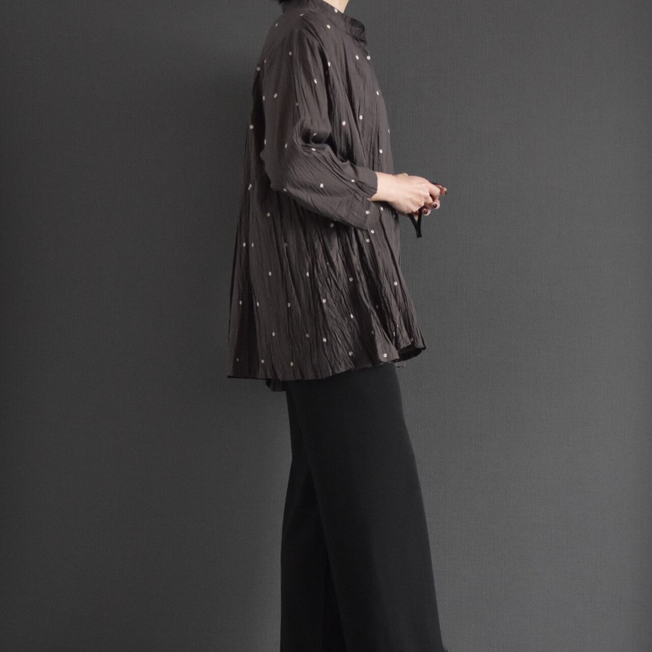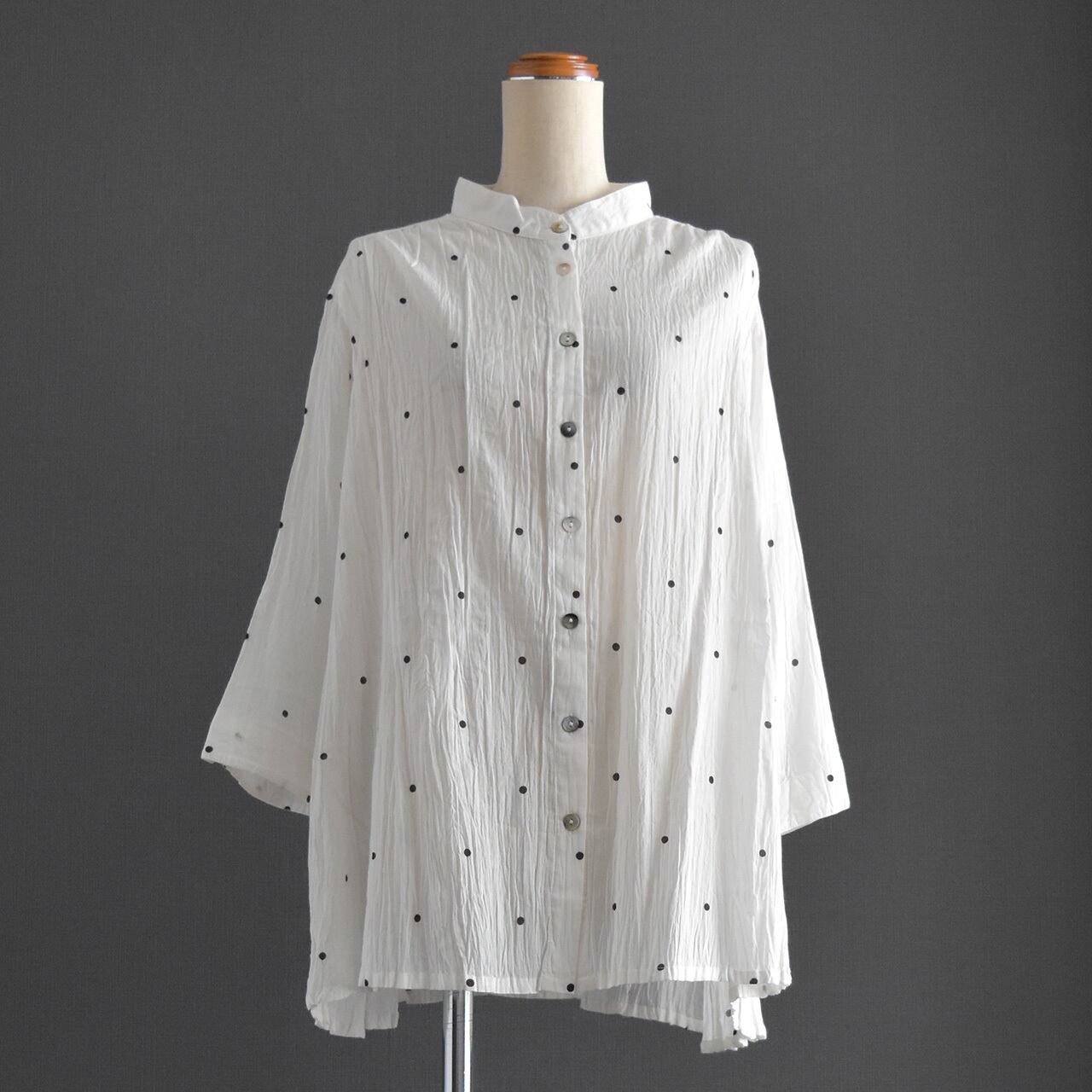 ナチュラルなシワ感とさりげないドット柄が、やわらかく上品な印象に。