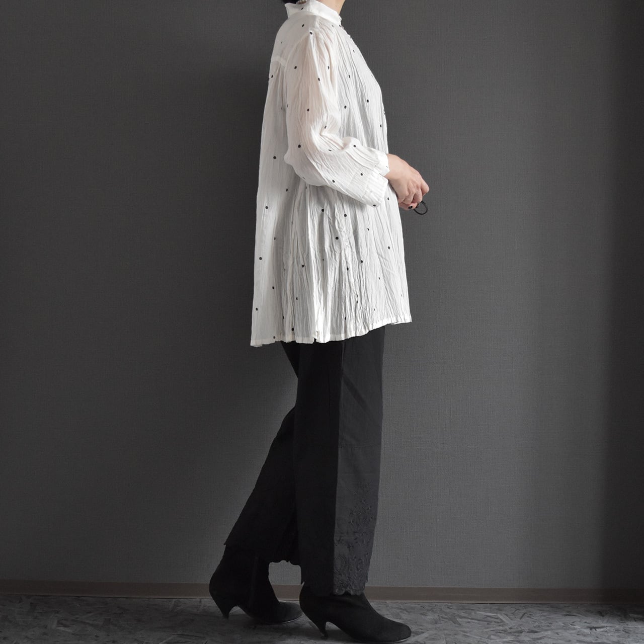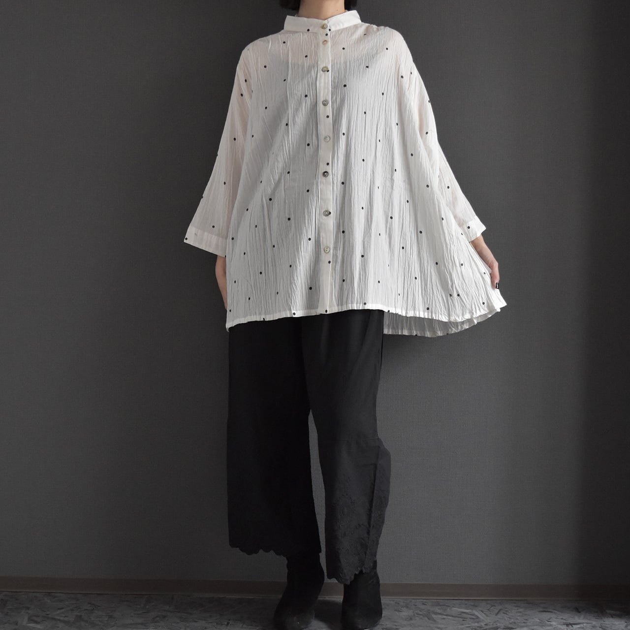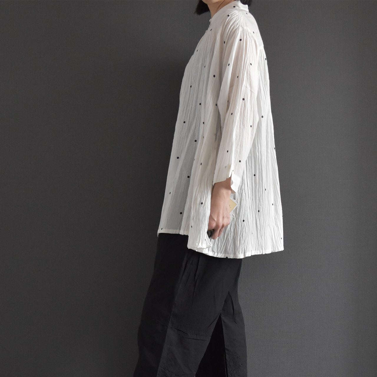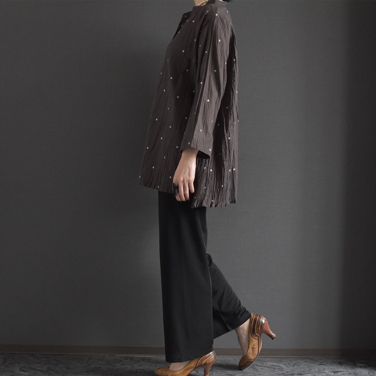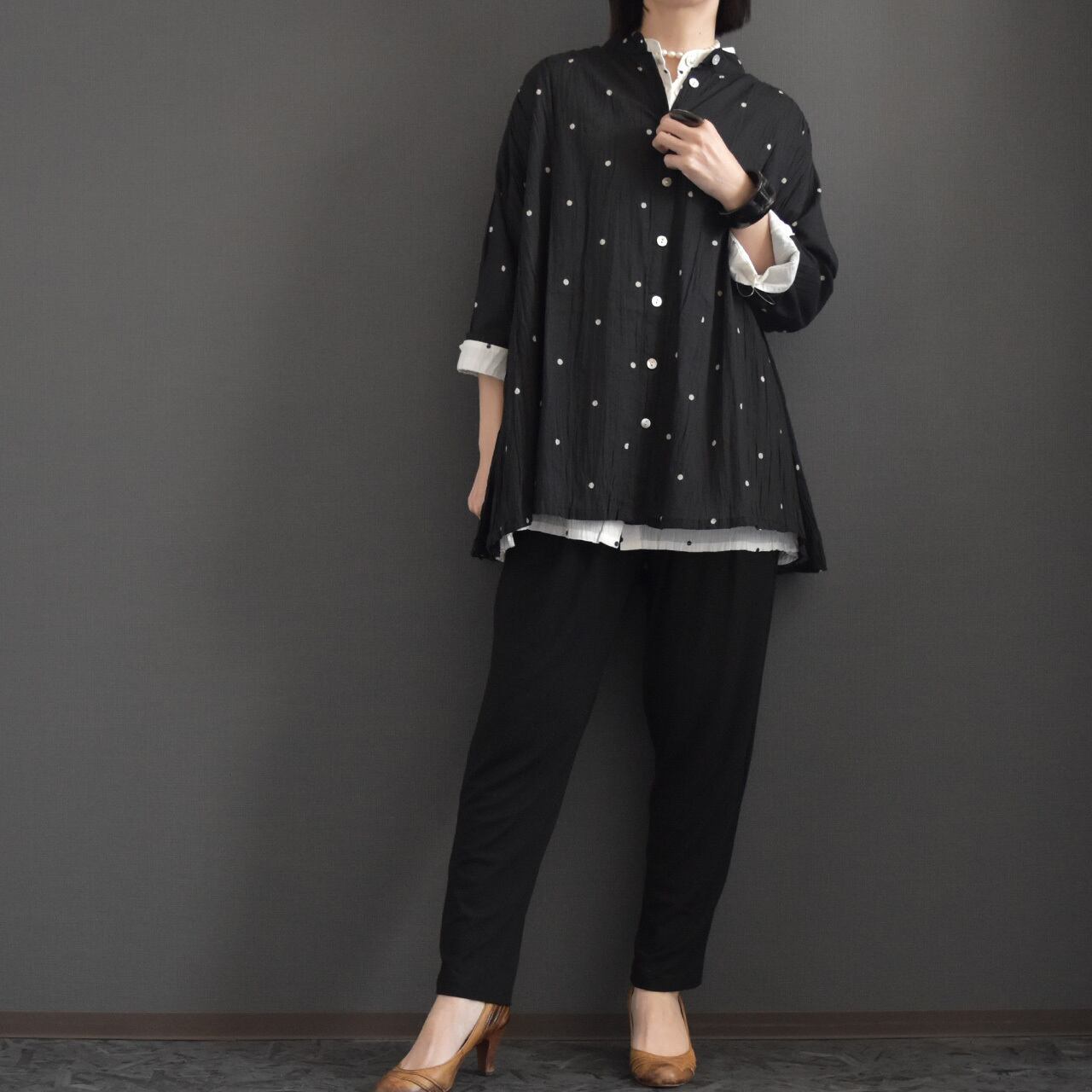 ナチュラルなシワ感とさりげないドット柄が、やわらかく上品な印象に。