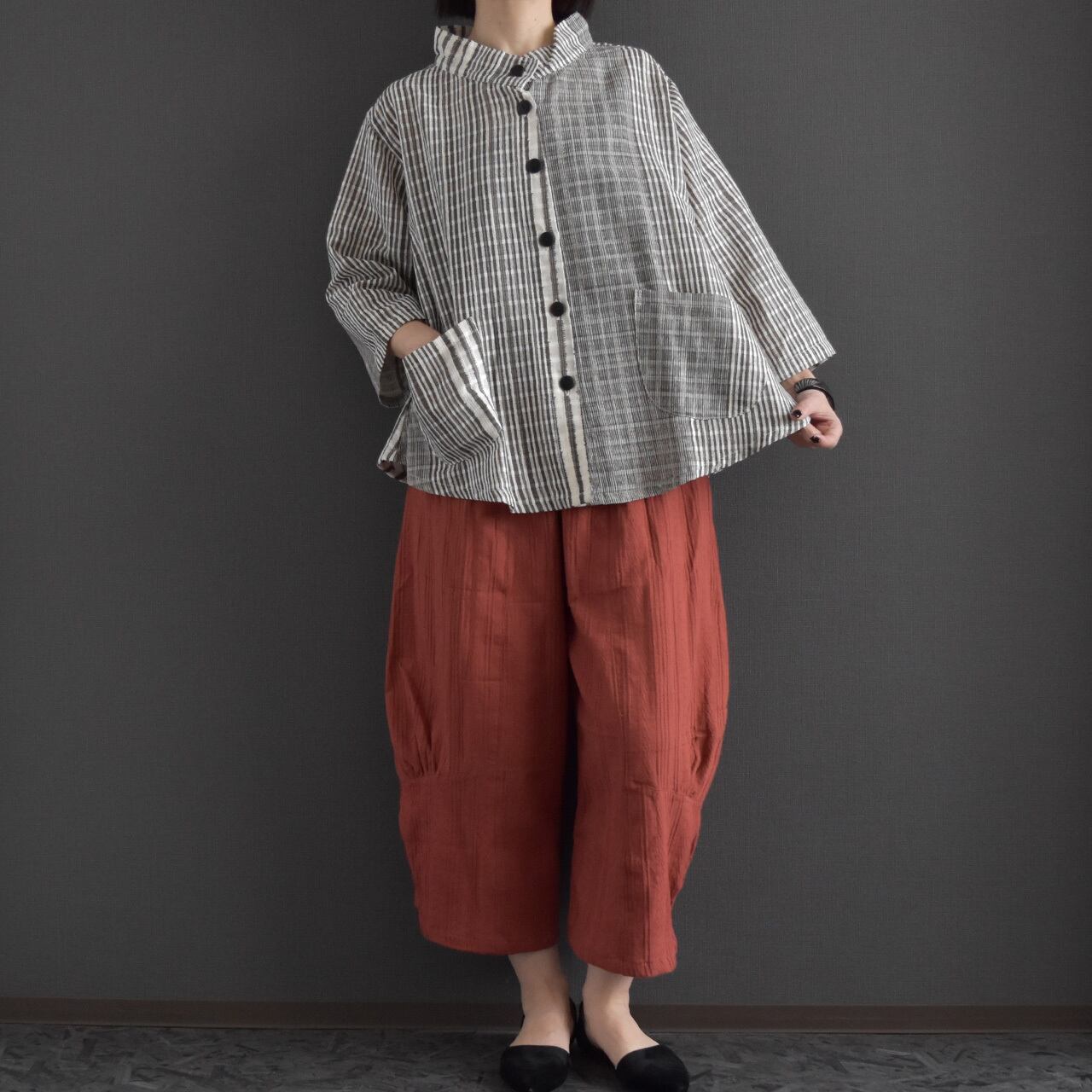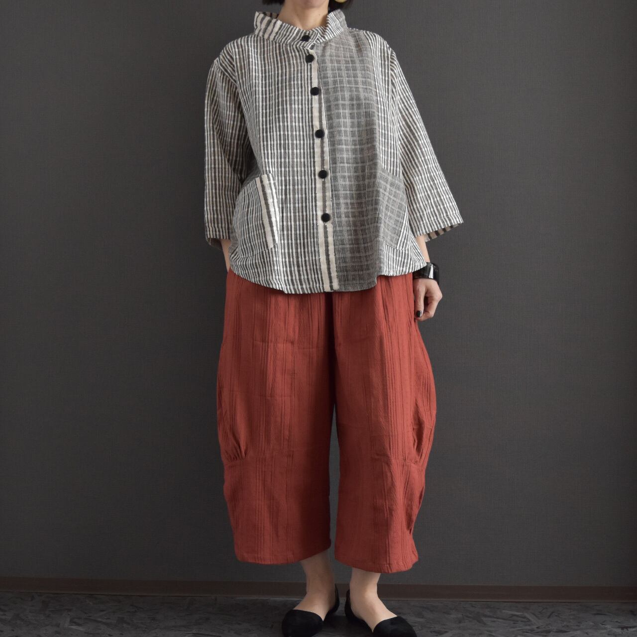 表情のある生地感とやわらかな落ち感が、リラックス感のある大人カジュアルを演出します。